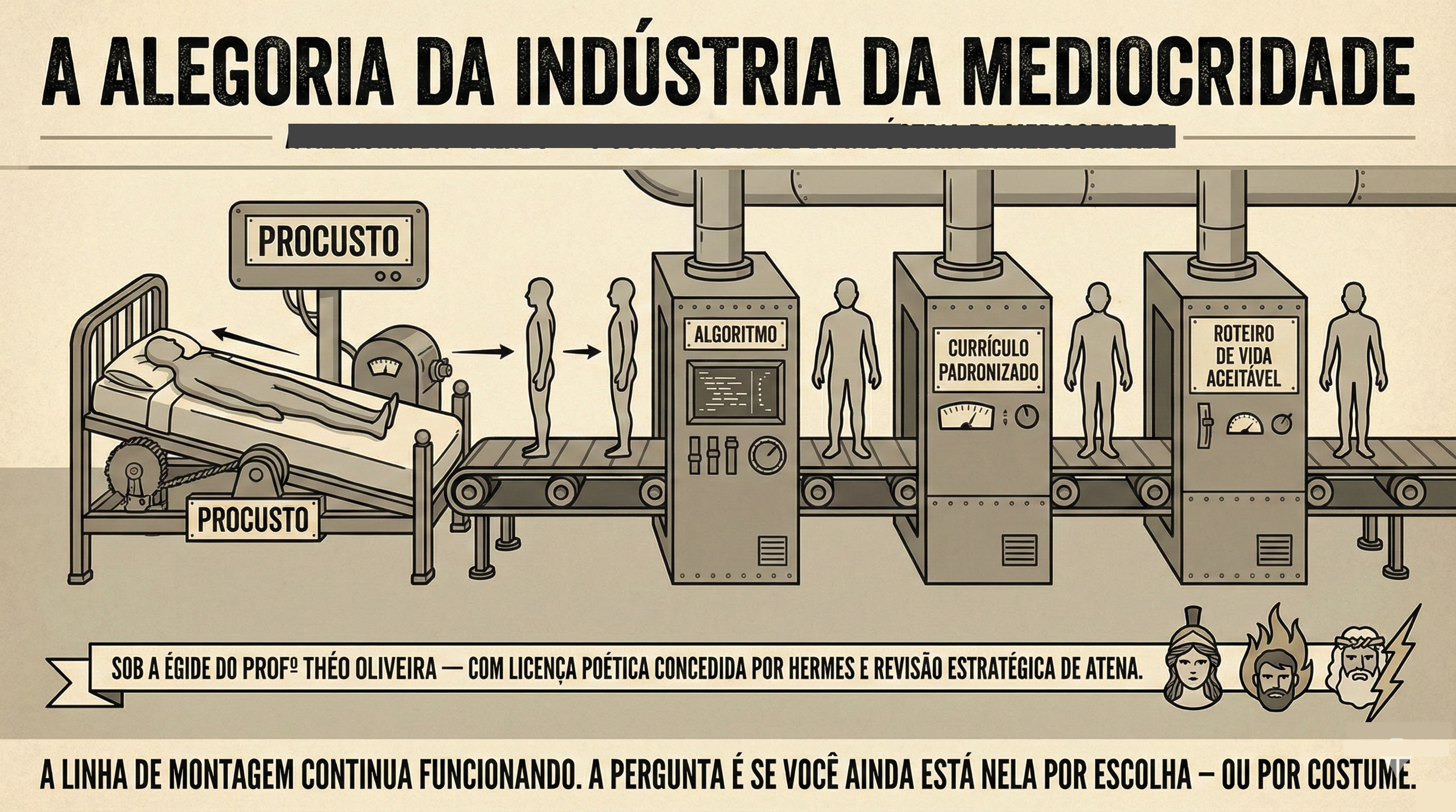 🏛️ A partir do mito de Procusto — o anfitrião que não mudava a cama, apenas mutilava o humano — o texto revela como a lógica antiga foi apenas atualizada: hoje, a cama atende por algoritmo, currículo padronizado e curadoria automática do pensamento.