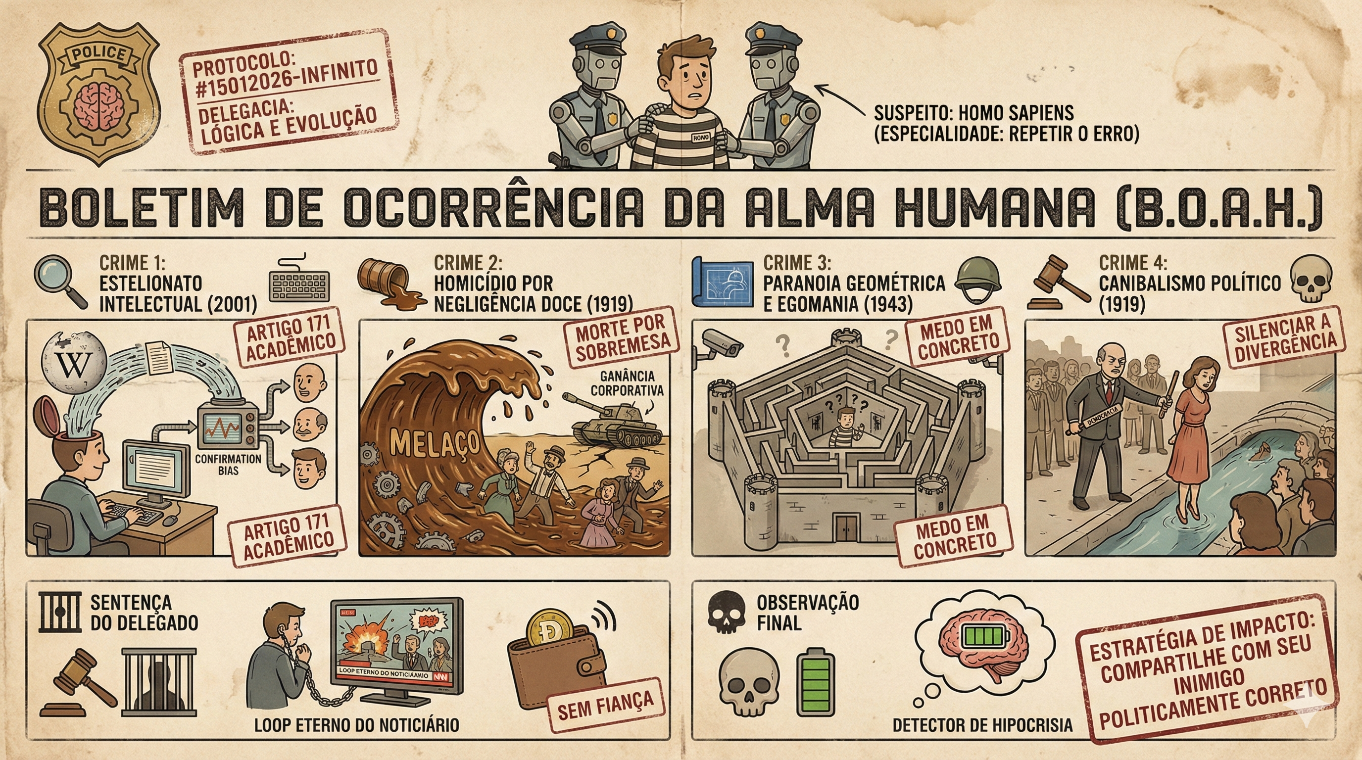 🧐 Após análise pericial do comportamento da espécie nesta data ao longo dos séculos, os peritos (eu e o meu desprezo por mediocridade) registraram as seguintes infrações graves contra a dignidade da inteligência universal: