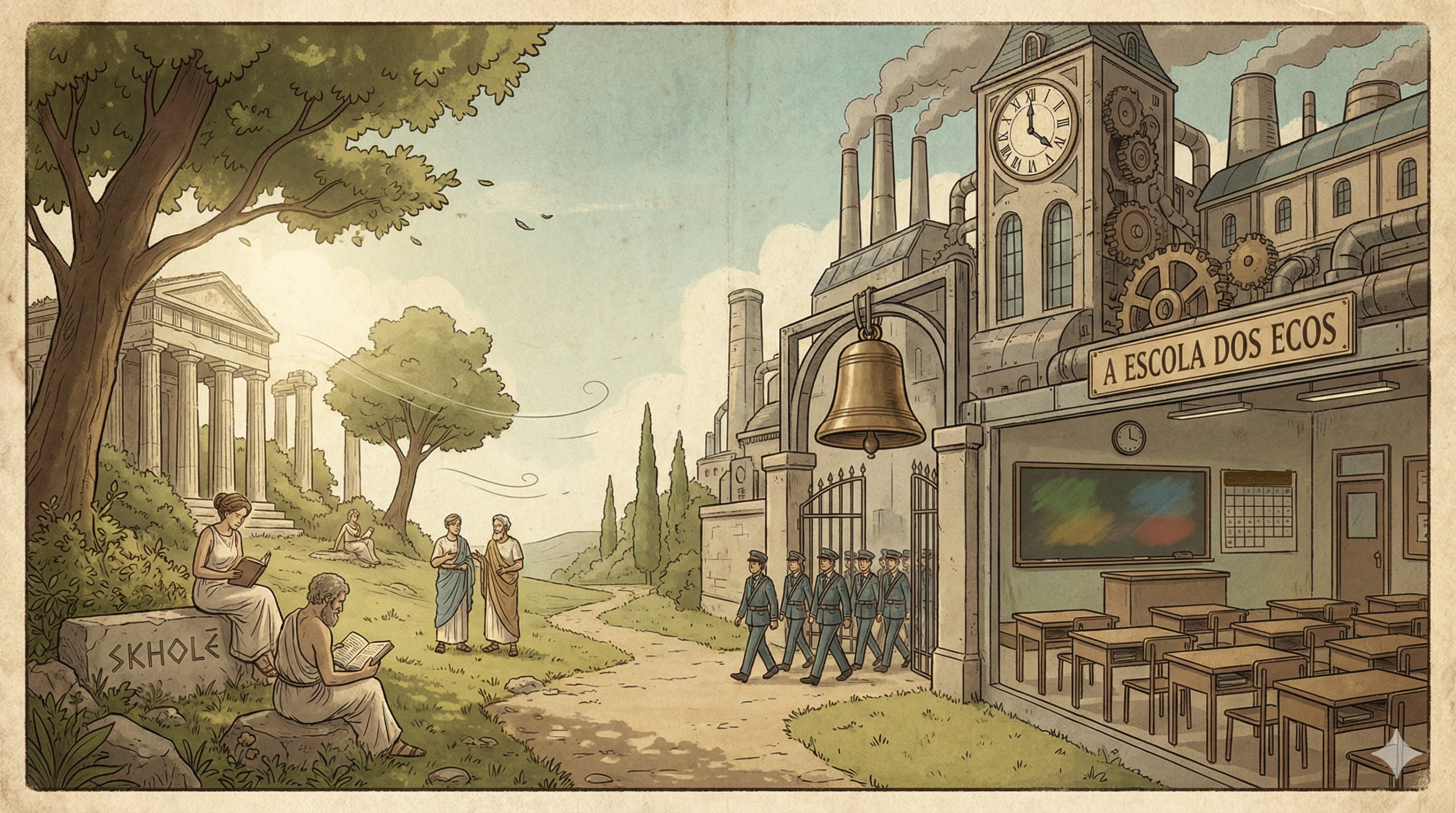 🏛️ Entre deuses atentos, ferreiros eficientes e calendários herdados de colheitas que já não existem, a Escola dos Ecos surge como metáfora de um sistema que repete formas sem lembrar por quê.